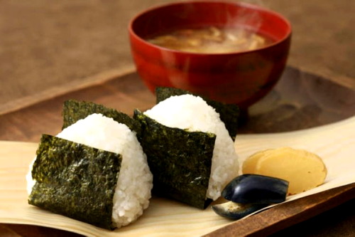 炊き立てご飯で作ったおむすびと味噌汁。